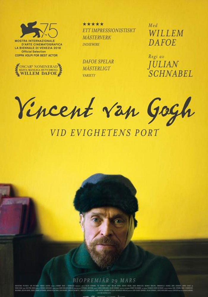 Vincent van Gogh dog 1890, bara 37 år gammal. Det saknas sannerligen inte biografier och filmatiseringar av hans liv, men glöm dem – Vid evighetens port är fullständigt oumbärlig för alla som är det minsta intresserade av den postimpressionistiske mästarmålarens liv och verk. För att inte tala om alla som söker filmupplevelser som griper tag, skakar om och får klockorna att stanna i två timmar. Mads Mikkelsen, Rupert Friend, Oscar Isaac och Emmanuelle Seigner bidrar alla med perfekta biroller, men det här är först och främst Willem Dafoes show. Den trefaldigt birollsnominerade stjärnskådisen borde nu ligga väldigt bra till för en huvudrollsoscar.
