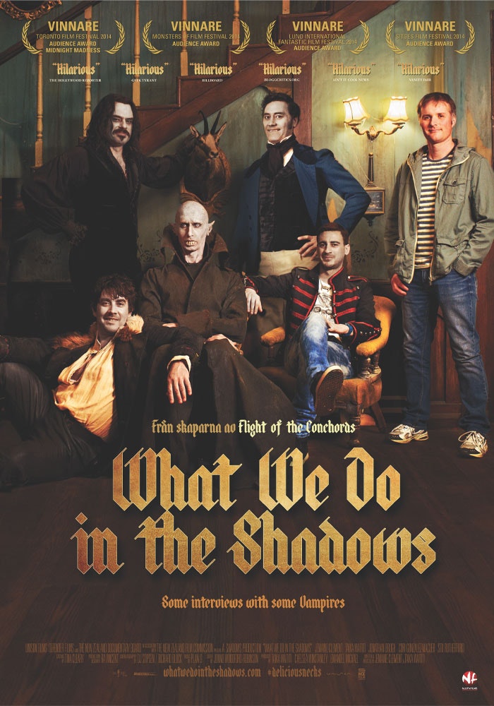 What We Do in the Shadows är en hysterisk underhållande (och blodig) komedi som med dokumentärfilmens stilgrepp hänsynslöst leker med vampyrgenrens alla troper. Filmen blev startskottet för en framgångsrik franchise med tv-serier och filmer, och är ett måste för alla fans av Flight of the Concords och The Office.